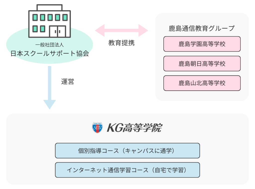 鹿島通信教育グループの「鹿島学園高等学校」「鹿島朝日高等学校」「鹿島山北高等学校」と教育提携し、関東・関西を中心に14キャンパスを展開する「KG高等学院」を運営しています。